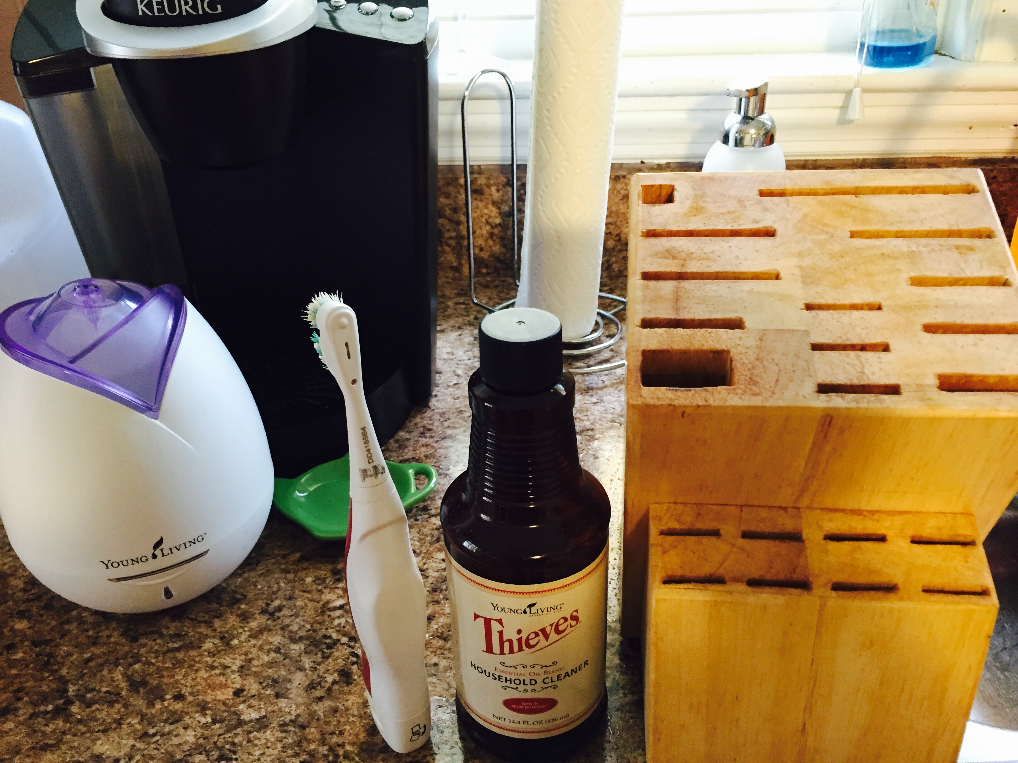 So, today I busted out my Young Living Thieves Cleaner bottle and went to town on my knife block, can opener, toaster, coffee maker, refridgerator (I certainly don’t clean it often enough,) my blender gasket, and all of my plastic spatulas! I have a premade spray bottle with 16 oz of distilled water and 2 capfuls of Thieves Cleaner and I got down to business cleaning. Then it came time to clean the knife block. How in the world can I clean that?