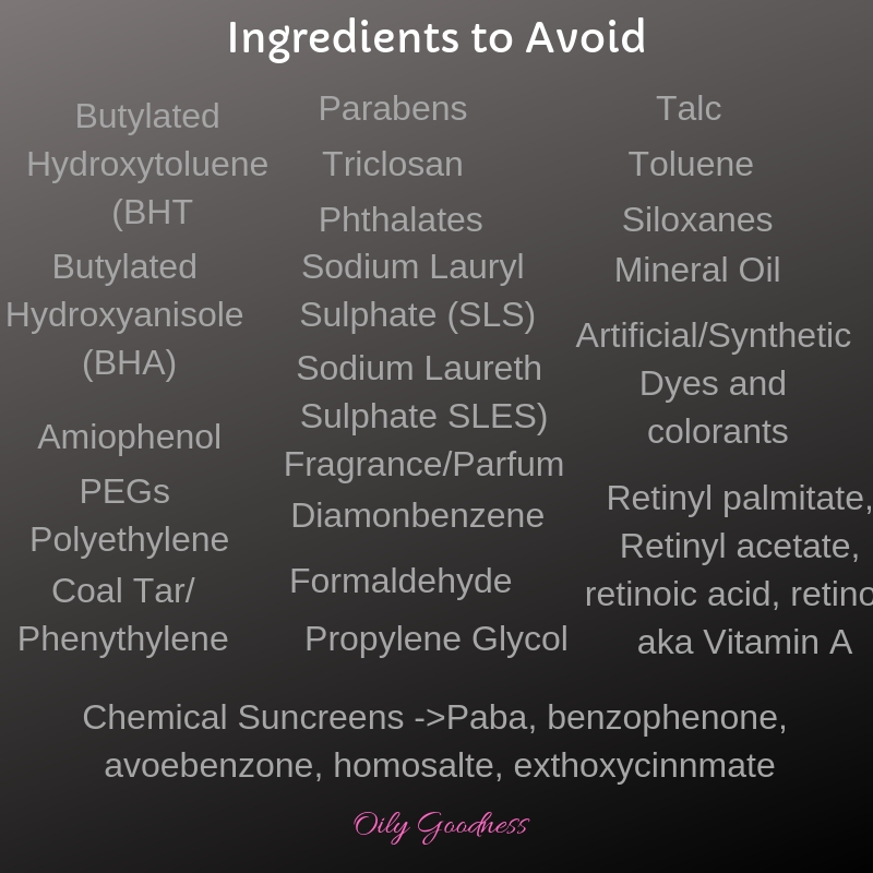 Ingredients you should try to avoid: retinyl palimitate, fragrance, parfum, triclosan, Cocamidopropyl betaine, quaternium-15, peg, sorbitan laurate, phenoxyethanol, potassium sorbate, butylated hydroxytoluene (BHT), butylated hydroxyanisole (BHA), Aminophenol, Coat Tar, Phenylethylene, Parabens, Sodium Lauryl (SLS), Sodium Laureth Sulphate (SLES), and so many more.